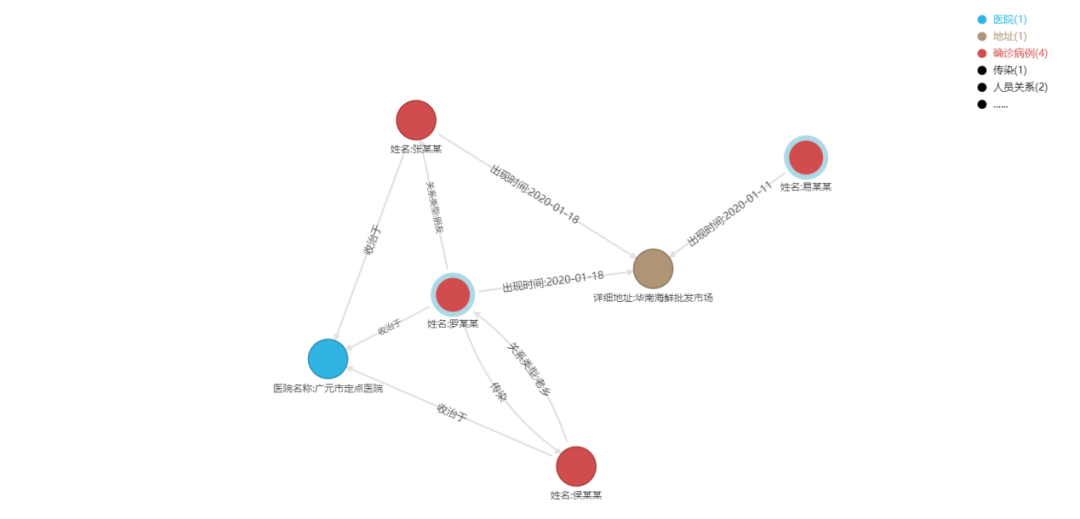 2、采集疫情上报的部分真实数据,进行模型数据转换和数据装载,效果如图2所示。其中各类实体均包含必要的实体信息。