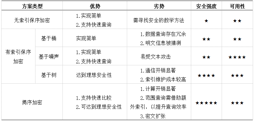表1从优势、劣势、安全强度、可用性等维度分析了不同保序加密技术的区别。一般而言,无索引保序加密和基于桶的保序加密安全强度较低,不推荐使用;基于噪声的保序加密可以应用于安全性要求中等的场景;基于树的保序加密可以应用于安全要求高且对通信交互不敏感的场景;揭序加密可以应用于安全要求高且对存储空间不敏感的场景。