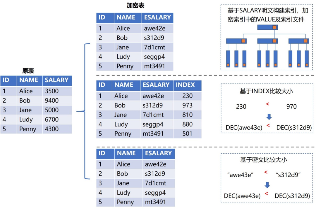 数据库敏感字段的加密保护及密文查询是保序加密的主要应用场景。图4描述了数据库保序加密的表结构及查询索引。
