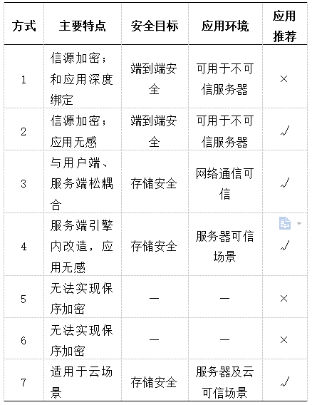 图5总结了数据库加密的7种方式。方式1和方式2为应用层加密,通过用户侧改造应用或者增加加密代理的方式实现信源加密。方式3为网关代理加密,以代理的方式进行加密、解密、索引、SQL改写等操作,以达到对用户透明、不(少量)改造数据库服务端的目的。方式4、方式5和方式6为服务器侧加密。其中,方式4的应用案例较多,数据库安全厂商纷纷通过“试图”+“触发器”+“索引接口”+“密码调用”的方式部署服务器侧透明加密插件,在数据库引擎内部实现透明加密。方式5和方式6为操作系统和硬件级加密,往往针对数据库全盘加密,无法满足保序加密需求。方式7为云服务的方式为数据库提供加密服务,多见于云数据库场景。