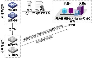 当数据使用者获取授权后,将需查询的范围的密文发给服务端。服务端根据密文对应的索引进行查询,将查询结果返回给数据使用者。数据使用者通过解密可使用数据。