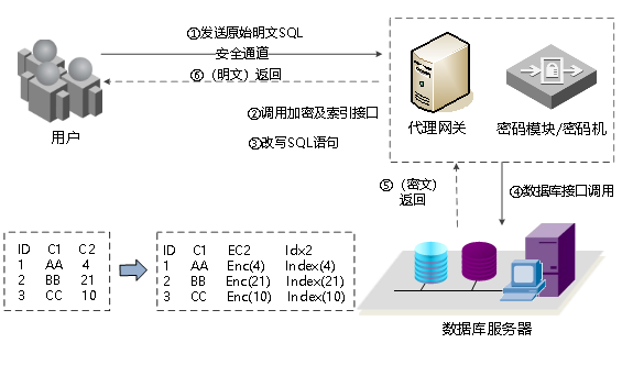 部分数据库厂商以旁路、串联等方式在数据库和用户之间构建代理网关,实现保序加密的同时,不对用户及数据库做任何改造,对于存量数据库的保序加密应用具有现实意义。