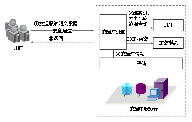 图8给出了数据库内保序加密的实现方案。用户使用安全通道将原始数据发送给数据库引擎模块。数据库引擎模块调用用户自定义函数模块UDF实现索引生成和查询比较,同时数据库引擎模块调用加密模块实现数据的加解密,最后数据库引擎模块向数据库存储模块进行数据的读写操作。