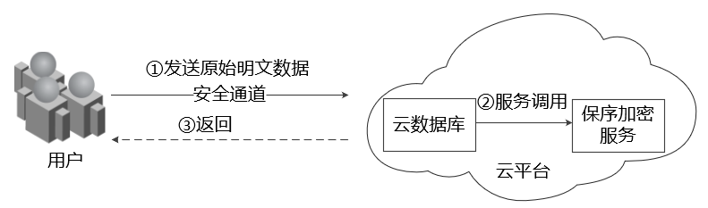 图9给出了云服务保序加密方案的一般性框架,用户使用安全通道将原始数据发送给云数据库,云数据库调用保序加密服务,实现数据的保序加密存储、查询等功能。
