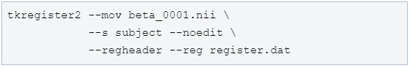 首先,用FreeSurfer的tkregister2命令创建一个名为register.dat的变换矩阵register.dat。其中beta_0001.nii是被试的Volume空间。