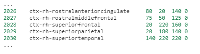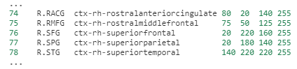 有个这个mask文件后,提取数据也是常规操作了。需要注意的是label的信息在Freesurfer中的FreeSurferColorLUT.txt文件中(如下图),这里mask的2026对应rh-rostralanteriorcingulate。
