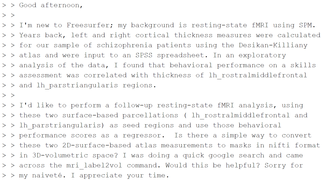 在FS的email list中有这样一个类似的问题,大概就是先找到皮层厚度差异的两个ROI,还想看一下这两个ROI的resting-state数据,怎么转到volume的空间。
