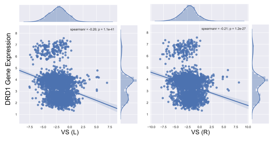 几年前偶然知道了AHBA,当时用的是alleninf做brain map和gene expression的相关,在随后的python课程中选择AHBA做了一个关于使用API的中期项目,还做过两个青铜级别的研究项目,其中一个将任务态功能连接结果和多巴胺受体基因(DRD1和DRD2)表达做了相关,有一些有意思的结果,如下。