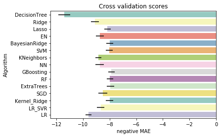 # Regression problemimport pandas as pdimport matplotlib.pyplot as pltimport seaborn as snsimport numpy as npfrom sklearn import model_selectionfrom sklearn.metrics import make_scorer, mean_squared_errorfrom sklearn.svm import SVR, LinearSVRfrom sklearn.tree import DecisionTreeRegressorfrom sklearn.linear_model import LinearRegression,Ridge,Lasso,ElasticNet,BayesianRidge,SGDRegressorfrom sklearn.gaussian_process import GaussianProcessRegressorfrom sklearn.neighbors import KNeighborsRegressorfrom sklearn.tree import DecisionTreeRegressorfrom sklearn.neural_network import MLPRegressorfrom sklearn.ensemble import GradientBoostingRegressor,RandomForestRegressor,ExtraTreesRegressorfrom sklearn.kernel_ridge import KernelRidgemodels=[]models.append(('DecisionTree', DecisionTreeRegressor()))models.append(('Ridge', Ridge()))models.append(('Lasso', Lasso()))models.append(('EN', ElasticNet(alpha=0.001,max_iter=10000)))models.append(('BayesianRidge',BayesianRidge()))models.append(('SVM',SVR()))models.append(('KNeighbors',KNeighborsRegressor()))models.append(('NN',MLPRegressor()))models.append(('GBoosting',GradientBoostingRegressor()))models.append(('RF',RandomForestRegressor()))models.append(('ExtraTrees',ExtraTreesRegressor()))models.append(('SGD',SGDRegressor(max_iter=1000,tol=1e-3)))models.append(('Kernel_Ridge',KernelRidge(alpha=0.6, kernel='polynomial', degree=2, coef0=2.5)))models.append(('LR_SVR',LinearSVR()))models.append(('LR',LinearRegression()))def compare_scores_mae(models, X, y):cv_means = []cv_std = []cv_resutls= []names=[]for name,model in models:kfold = model_selection.KFold(n_splits=10)cv_results = model_selection.cross_val_score(model, X, y, cv=kfold, scoring='neg_mean_absolute_error',n_jobs=10)cv_means.append(cv_results.mean())cv_std.append(cv_results.std())names.append(name)msg = "%s: %f (%f)" % (name, cv_results.mean(), cv_results.std())print(msg)cv_res=pd.DataFrame({"CrossValMeans":cv_means,"CrossValerrors": cv_std,"Algorithm":names})g = sns.barplot("CrossValMeans","Algorithm",data = cv_res, palette="Set3",orient = "h",**{'xerr':cv_std})g.set_xlabel("negative MAE")g = g.set_title("Cross validation scores")return cv_res