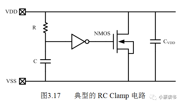 典型的RC Clamp钳位电路如图3.17所示(实际应用中反相器为三级),在ESD事件发生时他们可以提供一条额外的分流路径。这些瞬态钳位利用了ESD脉冲快速的dv/dt,通过电容耦合电荷到内部控制节点。这个节点的电压或者电荷被用来触发电路,比如一个晶体管,对于ESD脉冲提供一条从电源到地泄放通道。最终,控制节点通过电阻R泄放,钳位管关闭。这种方法的缺点是在电源正常上电的过程有限的噪声免疫力和钳位管电势。对于HBM ESD应力大约600-750ns,为了设计合适的RC电路,RC时间常数必须设计大于1ms来触发钳位管,保持在整个ESD事件过程中钳位管处于导通状态。为了满足这个标准,R通常用50kΩ的N阱电阻实现,C用20pF NMOS晶体管poly栅电容实现。时间常数需要的大电阻和电容占很大的面积。应当仔细仿真电源线最大电容和耦合电容,因为这些电容可能影响钳位管的触发效率。这是因为ESD事件不仅给控制电路电容充电,也给寄生电容充电。结果是,ESD钳位管的开启时间增加。