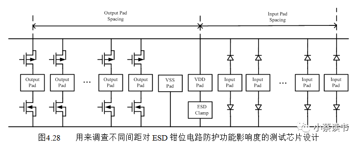 从图4.29可以看出,随着输入/输出管脚和钳位单元距离的增加,ESD的耐压能力下降了很多,这表明电源线上的杂散电容/电阻对全芯片ESD保护能力的负面影响很大。为了使电源线上的寄生电容/电阻对ESD防护能力影响满足设计要求,电源线的尺寸以及钳位单元的摆放位置都必须满足一定的要求。