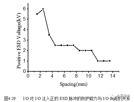 图4.28显示了该实验的布局设计,连接输入/输出脚与VDD PAD的是宽30μm的电源线,连接输入/输出脚与VSS PAD的也是宽30μm的电源线。该实验芯片流片工艺采用0.8μm标准CMOS工艺,管脚与管脚之间的ESD耐压特性如图4.29所示,当两个管脚相隔越远时,其ESD耐压能力越低。