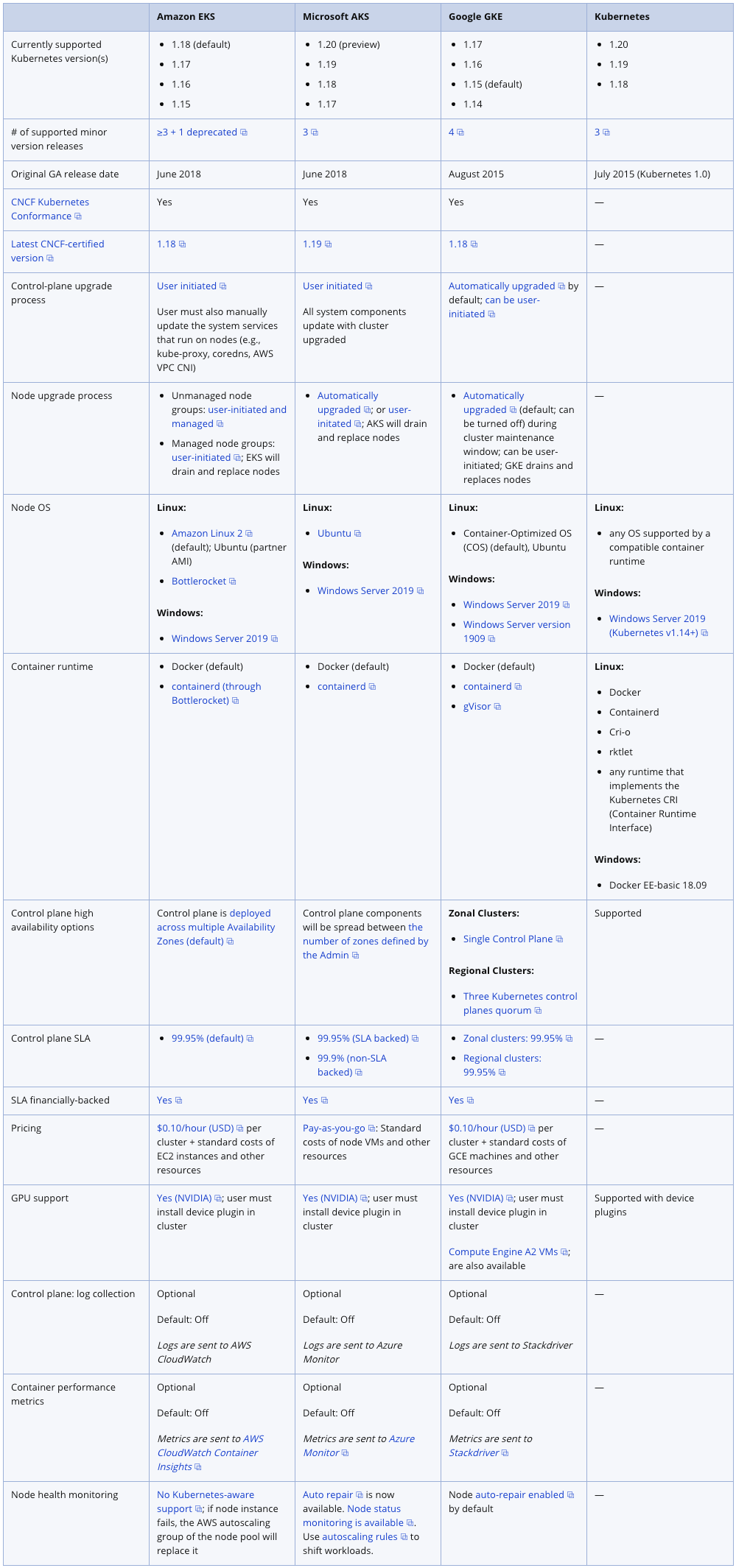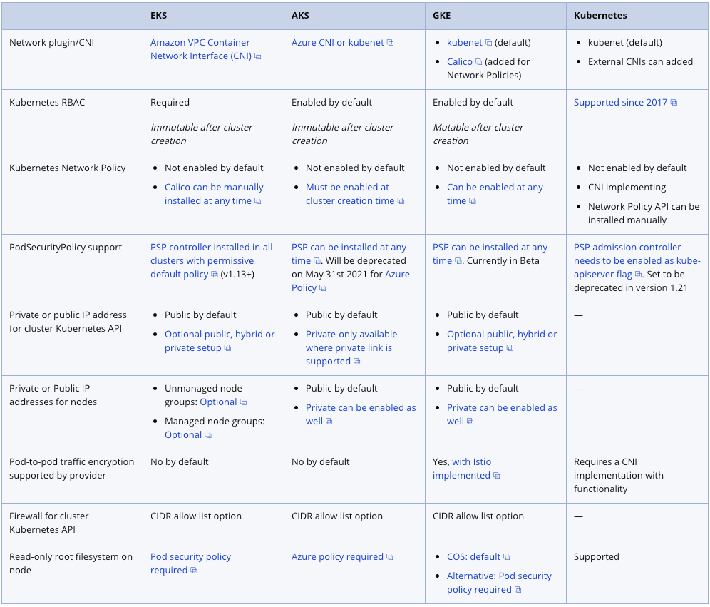 StackRox 报告:https://www.stackrox.com/post/2021/01/eks-vs-gke-vs-aks-jan2021/ AKS 文档:https://aka.ms/aks/docs GKE 文档:https://cloud.google.com/kubernetes-engine EKS 文档:https://aws.amazon.com/eks/