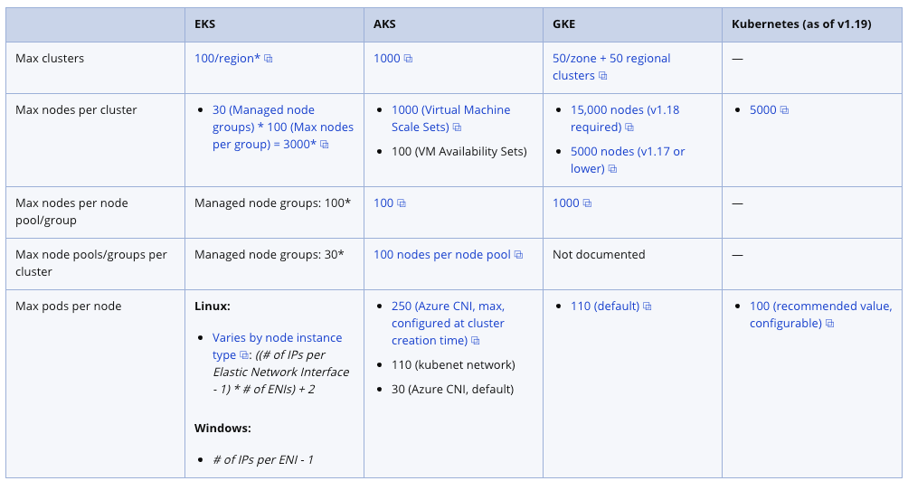 在集群节点数量上,GKE 最多支持 15000 个节点,EKS 支持 3000 个节点,而 AKS 暂时只支持 1000 个节点。 在节点池数量上,AKS 支持 100 个节点池,EKS 支持 100,而 GKE 没有明确的文档。 在每个节点池支持的节点数量上,AKS 和 EKS 都支持 100,而 GKE 支持 1000。 在每个节点支持的 Pod 数量上,AKS 支持 250,GKE 支持 110, 而 EKS 需要用户根据具体网络配置计算。