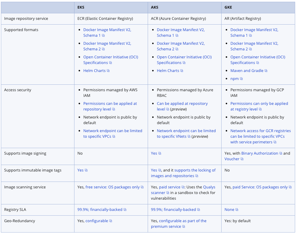 综合这些镜像服务的特性,可以发现三个平台提供的镜像服务基本类似,AKS 和 EKS 支持托管 Helm Charts,是相对于 GKE 的优势。
