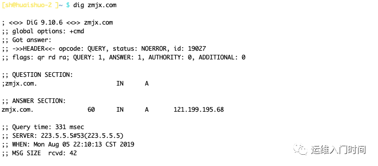 dig 命令默认的输出信息比较丰富,可以分了5个部分。