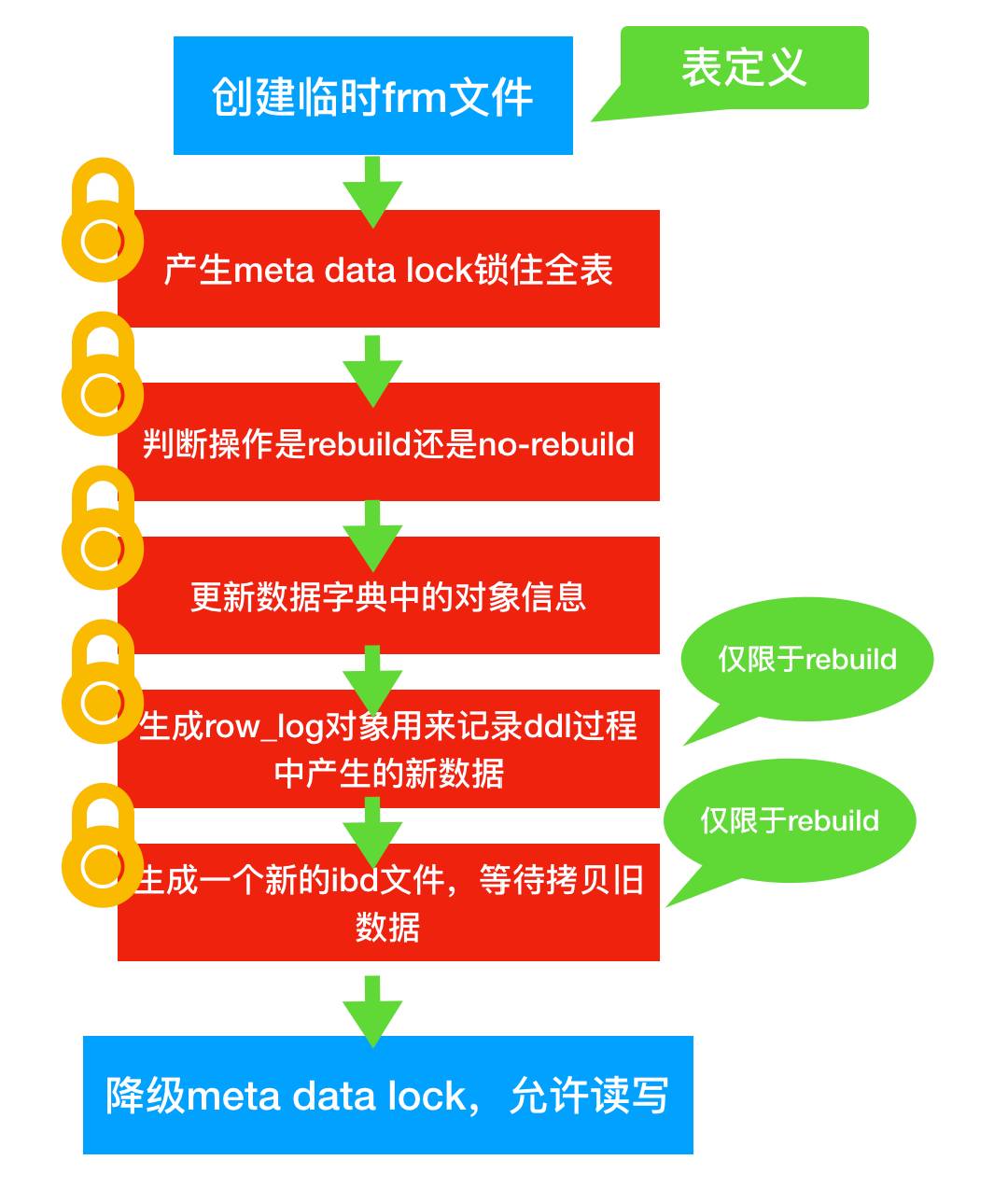 在阐述原理前,还要说明,Online DDL的执行分两类,这个用户无法选择,是由操作本身属性决定的。如果我们执行的是添加普通索引、删除普通索引、设置默认值、修改自增长值、添加删除外键或改列名等操作,那么我们的执行叫做no-rebuile。我们可以看到这类操作基本上不需要重建立一份数据(一张表)但是,像添加列、删除列、修改列数据类型、修改表索引等等这些操作,都叫做rebuild,也就是需要创建重建一份数据(一张表)。