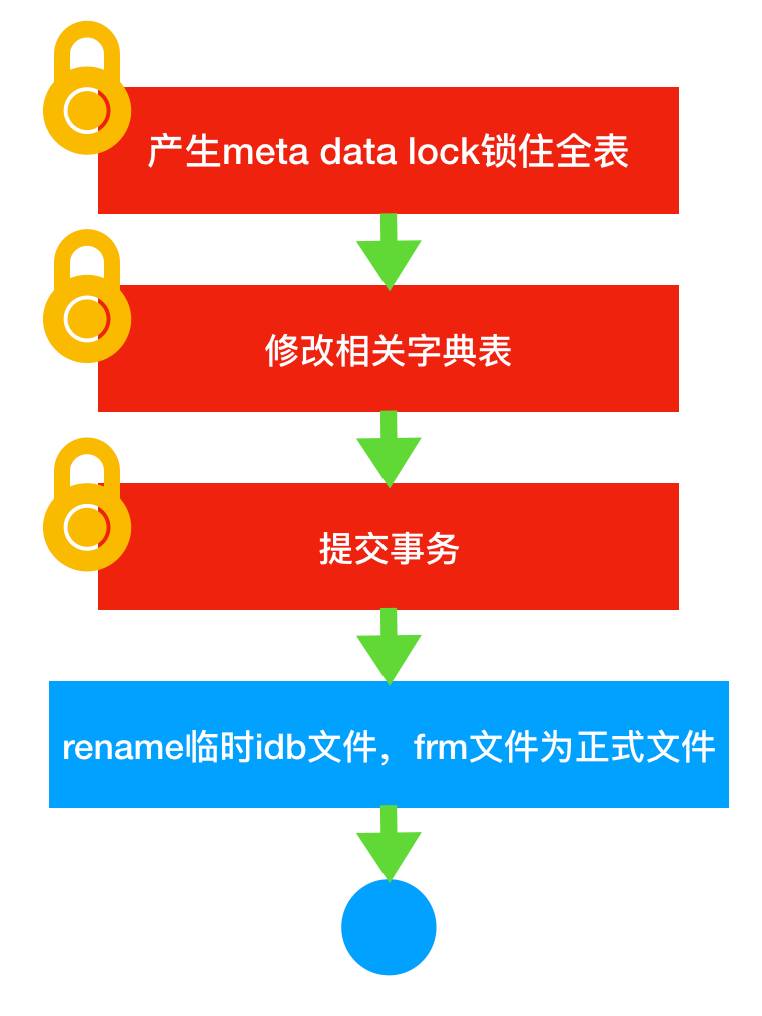 由于在这个阶段我们要修改数据字典,所以meta data lock又会出现,在这个阶段我们的表是不支持DML语句的,时间依然很短。但是用户的一些写操作会遇到waiting meta data lock等待。