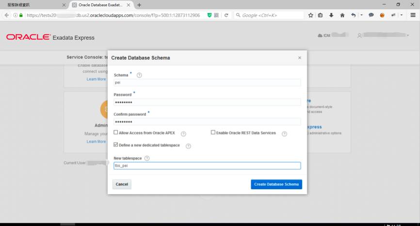 创建Schema也比较简单,输入用户和密码,这里我不需要APEX和REST Data Services,指定了个独立的表空间,点击蓝色按纽就完成了用户创建。