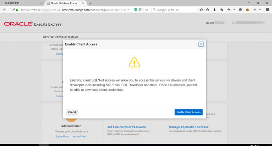 作为最传统的C/S访问,如何完成呢?首先要启用客户端访问,在Exadata Express界面里在Client Access管理项中,点击Enable Client Access