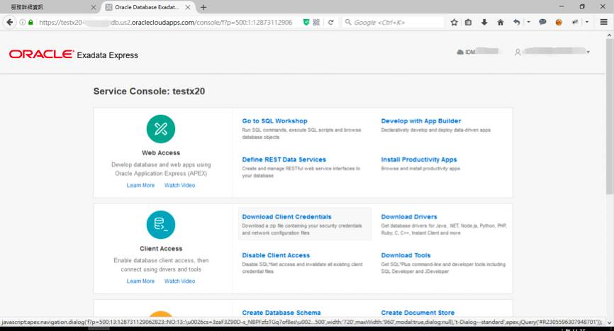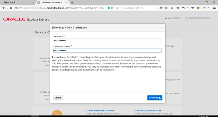 点击蓝色按纽启用客户端访问后,在Exadata Express管理界面的Client Access就多了几项,包括下载客户端的认证包、下载驱动等。