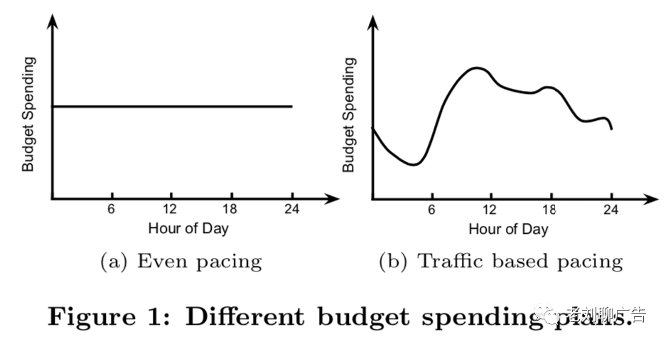 达成投放和效果目标:对于品牌宣传活动来说,目标通常是花费预算来触达广泛的受众,同时使得广告活动的效果尽可能的好。对于效果广告活动来说,目标通常是达到效果目标,同时花费尽可能多的预算。其它广告活动的目标通常介于这两个目标之间 执行预算消耗计划:广告主通常希望他们的广告可以在投放计划时间段内匀速地展示,以达到更广泛的受众和可持续的影响,并增加与其它媒体(如电视和杂志)广告活动的协同效应。因此,广告主可能会有他们个性化的预算消耗计划。图一给出了两个预算消耗计划的例子:平稳调节和基于流量的调节 降低创意服务成本:除了dsp收取的成本外,通常还有第三方创意服务提供商收取的创意服务成本。如今,随着越来越多的广告活动以视频或富媒体的形式出现,这一点变得更加重要。这类广告的创意服务成本可能与额外库存成本相当,因此广告商总是愿意降低成本,并有效地将广告投放给正确的用户