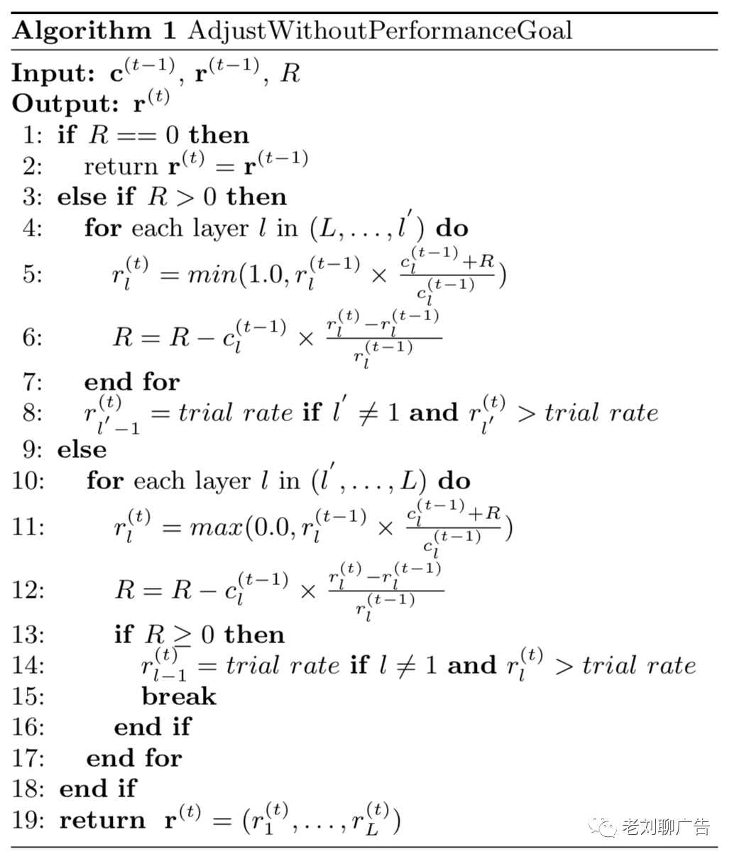 在调节算法中,非零平滑率挨着的层将会被分配一个实验平滑率,其目的是收集这一层的相关数据,为未来的加速做准备。这个实验平滑率应该是比较低的。我们通过预留预算的一定比例(如)来作为下一个时间段的支出计划,这里记试验层为第层,下一个时间段的预算支出计划是,回想一下,我们至少有这一层一个时间段的历史消耗和平滑率,则可以推导出试验平滑率为:,其中,和的历史平滑率和消耗