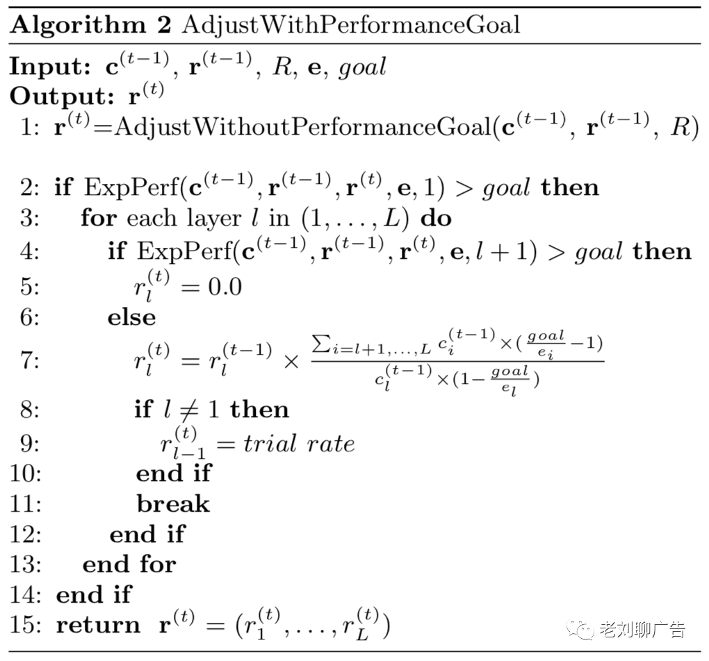 对于具有特定效果目标的广告活动,平滑率调节相对更加复杂。预测未来所有时段的广告请求流量是非常具有挑战性的,而反馈率分布是随时间变化的。因此,给定预算支出目标,探索当前时间段内所有满足效果目标的广告请求可能不是方程(3)的最佳解决方案。算法2描述了针对这种类型的广告活动,应该如何调整平滑率。在算法1的基础上,我们采用了基于效果目标进一步调整的启发式算法。在算法2中,如果期望效果不满足效果目标,平滑率将会从低优先级的层一个接一个降低以达到期望效果目标。第7行描述了为达到整体效果目标,当前层平滑率的计算方式。如果平滑率从调整到,第2~4行的函数描述了当前层的预估eCPC