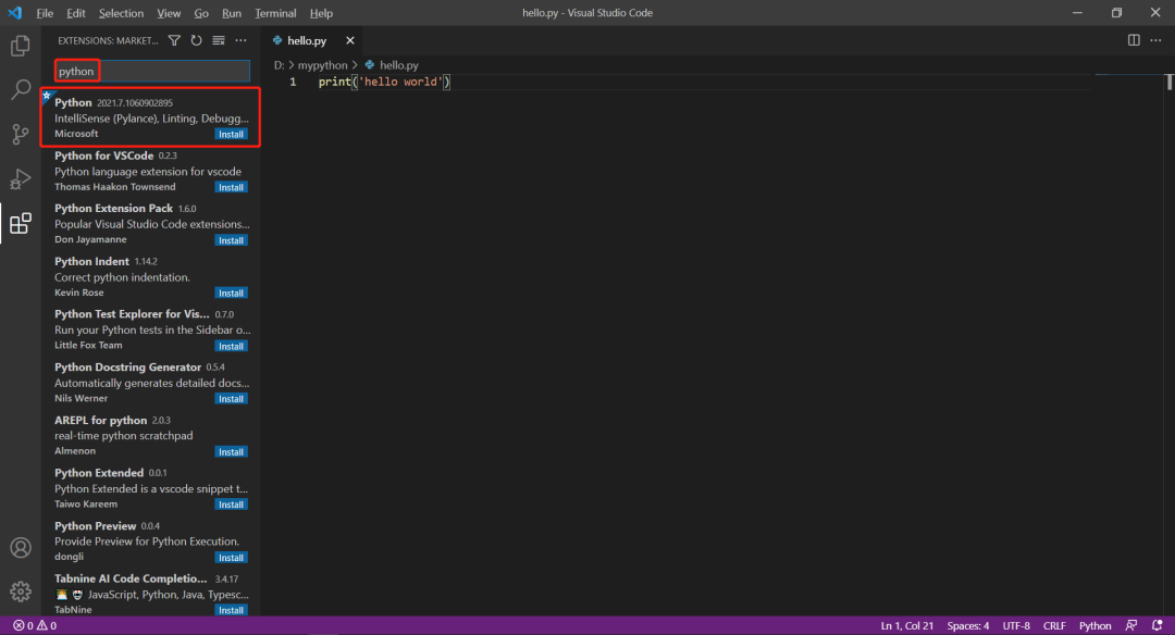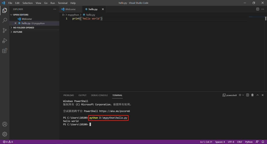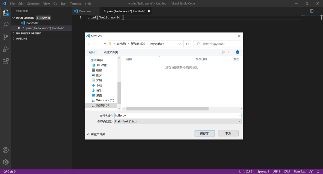 示例:读取 D 盘 mypython 目录下的 test.txt 文件内容(事先要建立好文件)。