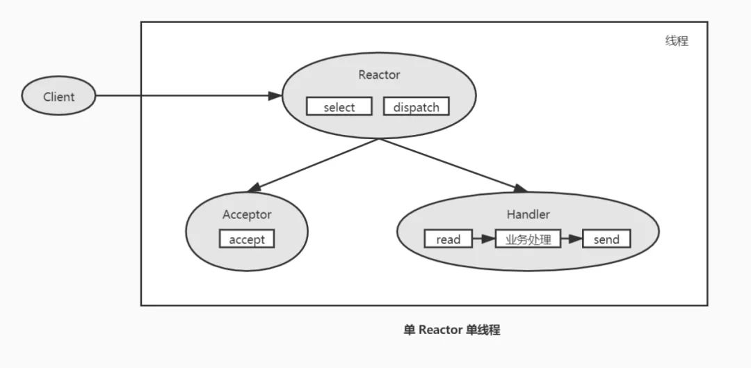 单 Reactor 单线程模型:由一个线程同时负责客户端连接、读写操作以及业务处理。