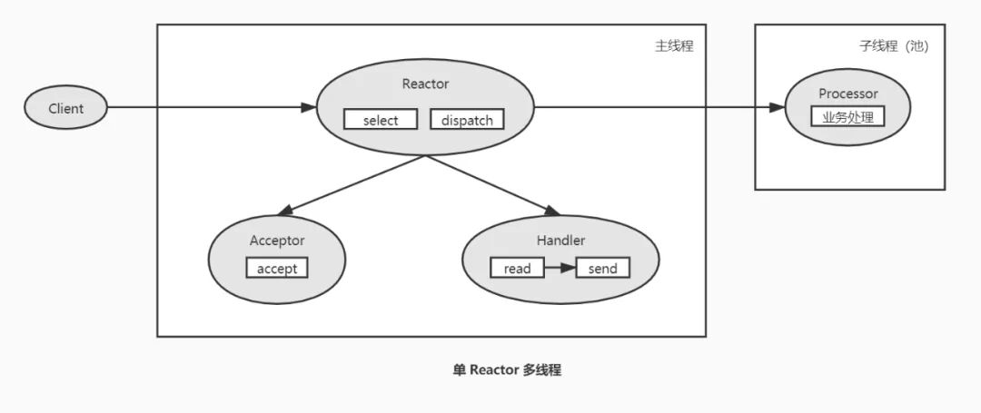 单 Reactor 多线程模型:一个 Acceptor 线程负责客户端连接,一个 NIO 线程池负责读写操作、业务处理。