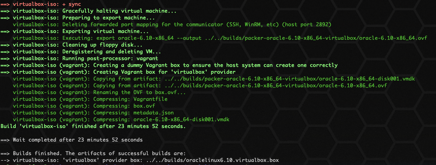 显示如上,即已经打包成功,box 位置存放在:../../builds/oraclelinux6.10.virtualbox.box 。