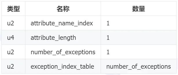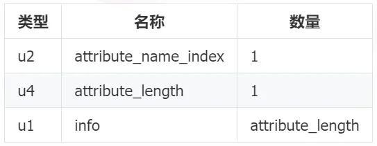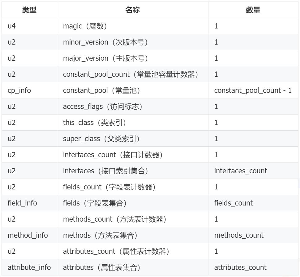 表:由多个无符号数或其他表作为数据项构成的复合数据类型,所有表都习惯性地以“_info”结尾。表用于描述有层次关系的复合结构数据,整个 Class 文件本质上就是一张表。
