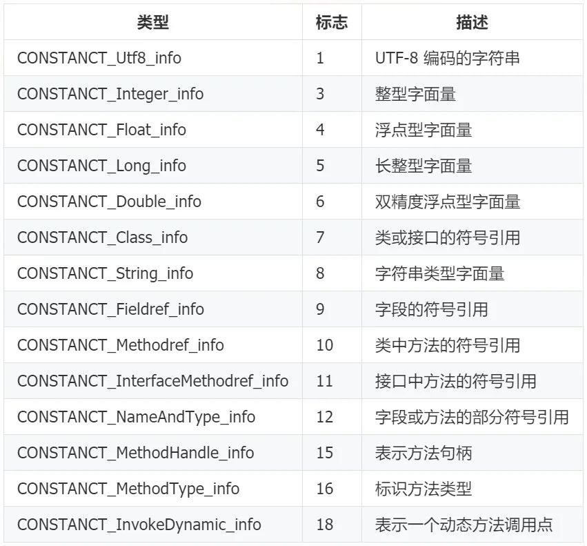 常量池主要存放两大类常量:字面量和符号引用。每一项常量都是一个表,这些表开始的第一位是一个 u1 类型的标志位,代表当前常量所属的常量类型。常量池目前有 14 种常量类型,它们各自均有自己的结构。
