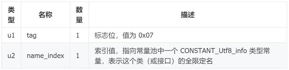 类索引:指向一个类型为 CONSTANT_Class_info 的类描述符常量,表示该类的全限定名。