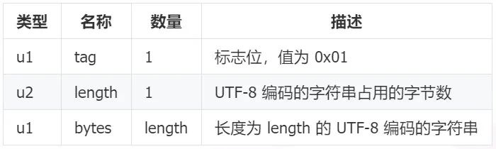 无符号数:基本数据类型,以 u1、u2、u4、u8 来分别代表 1 个字节、2 个字节、4 个字节和 8 个字节的无符号数。可用来描述数字、索引引用、数量值或按照 UTF-8 编码构成字符串值。