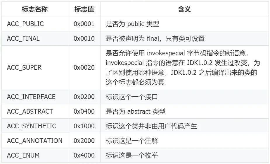 常量池之后,紧接着的两个字节代表访问标志,用于识别一些类或接口层次的访问信息,包括:这个 Class 是类还是接口、是否定义为 public 类型、是否定义为 abstract 类型、是否被声明为 final(只有类可设置)等。