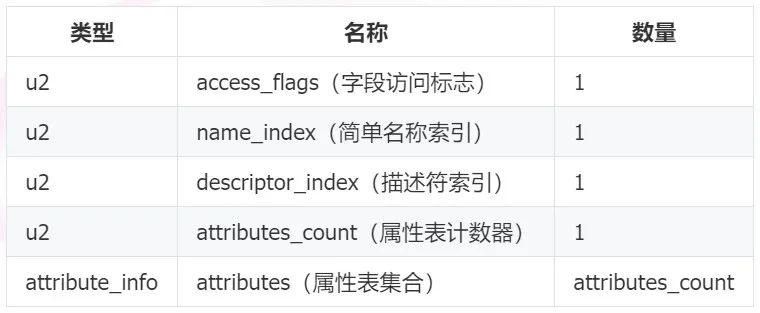 简单名称索引(name_index):指向常量池中一个 CONSTANT_Utf8_info 类型常量,代表字段的简单名称。