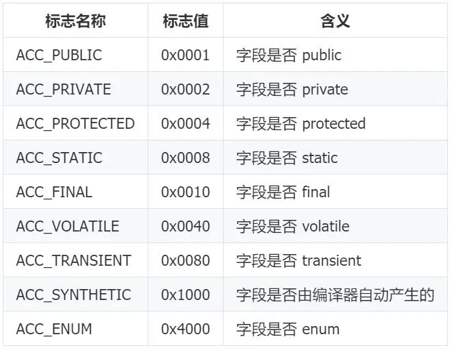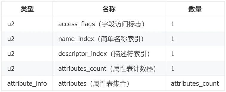 字段表用于描述接口或类中声明的变量。字段包括类级变量以及实例变量,但不包括在方法内部声明的局部变量。