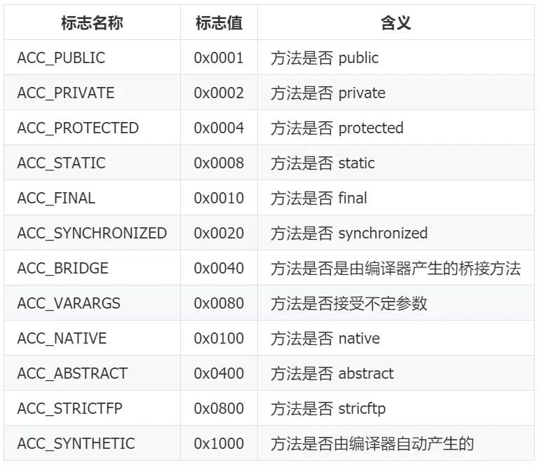方法表的结构与字段表一样,依次包括了访问标志(access_flags)、名称索引(name_index)、描述符索引(descriptor_index)、属性表集合(attributes)几项,这些数据项目的含义也非常类似,仅在访问标志和属性表集合的可选项中有所区别。