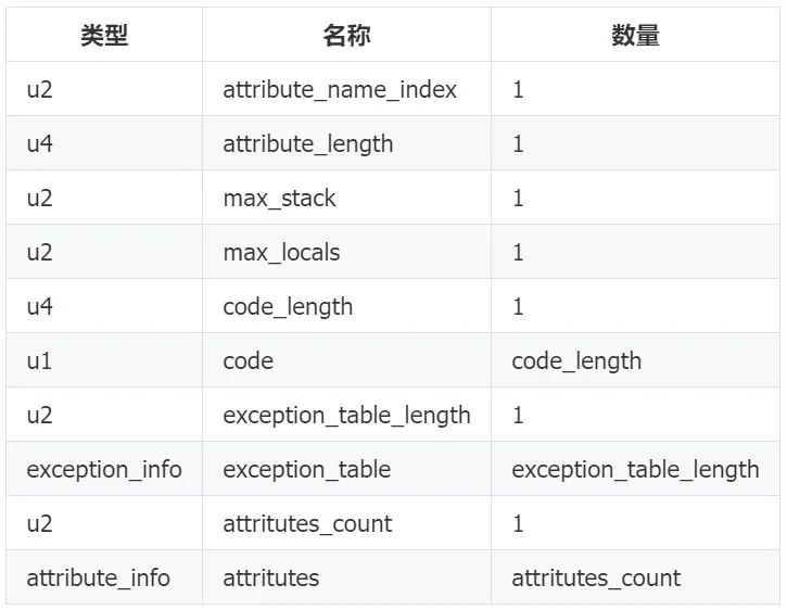 attribute_name_index:代表该属性的属性名称,是一项指向 CONSTANT_Uft8_info 型常量的索引,常量值固定为“Code”。