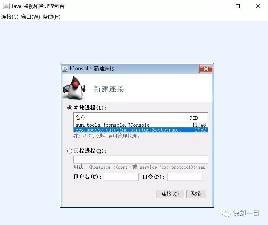 通过 JDK/bin 目录下的“jconsole.exe”启动 JConsole 后,将自动搜索出本机运行的所有虚拟机进程,不需要用户自己使用 jps 查询。双击选择其中一个进程即可开始监控,也可使用“远程进程”功能来连接远程服务器,对虚拟机进行监控。