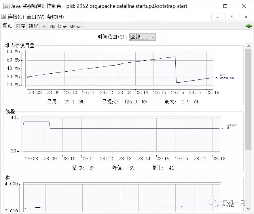 “内存”页签相当于可视化的 jstat 命令,用于监视受收集器管理的虚拟机内存的变化趋势。