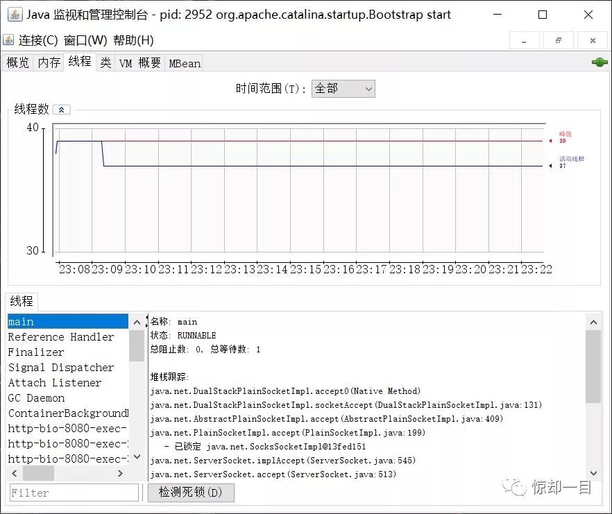 “线程”页签相当于可视化的 jstack 命令,遇到线程停顿时可使用该页签进行监控分析。