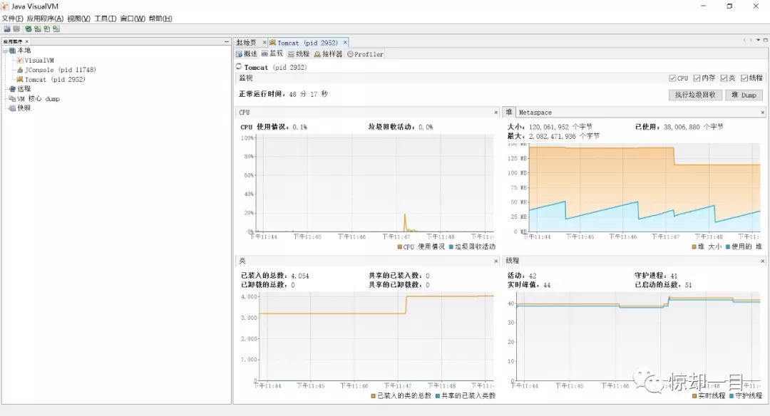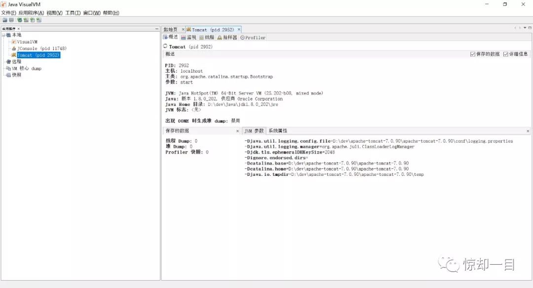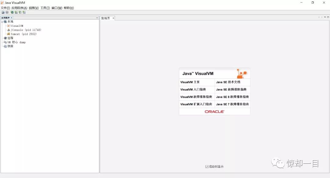 通过 JDK/bin 目录下的“jvisualvm.exe”启动 VisualVM 后,选择一个需要监视的程序即可进入主界面。