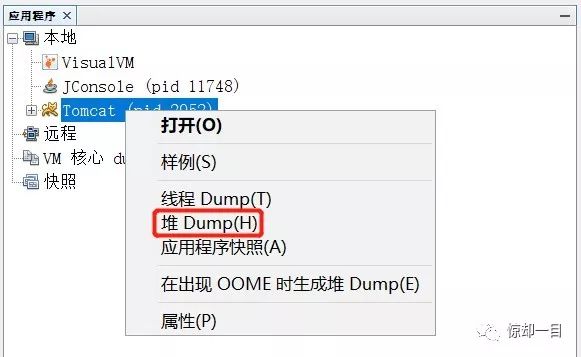 生成 dump 文件后,将在应用程序下增加一个以 [heapdump] 开头的子节点,并且在主页签中打开该转储快照。如果需要保存 dump 文件,要在 heapdump 节点上右键选择“另存为”。否则当 VisualVM 关闭时,生成的 dump 文件也会被删除掉。