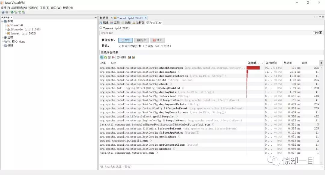 “Profiler”页签中,VisualVM 提供了程序运行期间方法级的 CPU 执行时间分析以及内存分析。