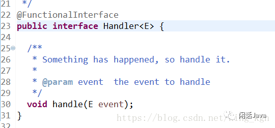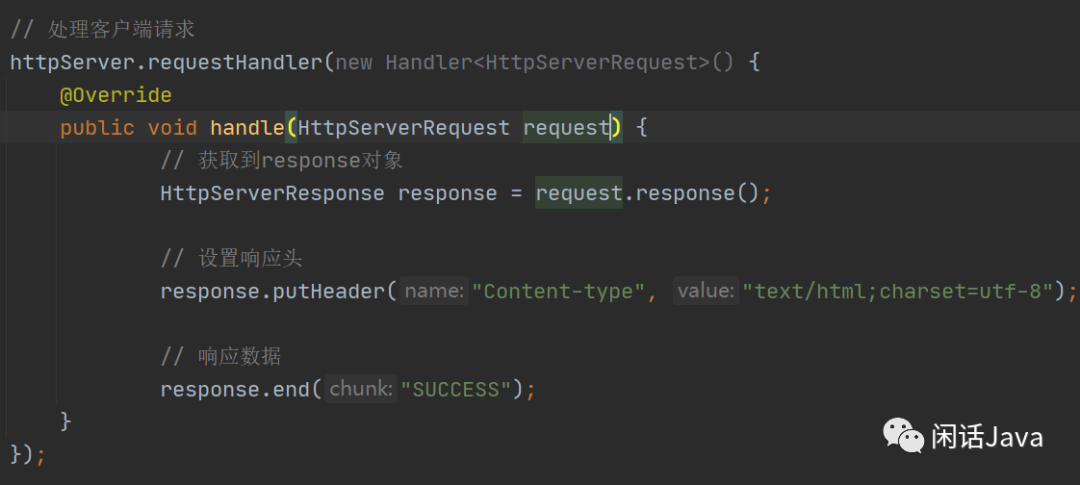 第二个是【->】符号,这也是一个新特性,可能看起来比较难懂,可以类比JavaScript来理解,JavaScript中有很多这样的写法。我们可以看到,这个方法实际上是接收一个Handle接口,Handle接口中有一个抽象方法 public void handle(HttpServerRequest request) ,这个方法有一个参数 HttpServerRequest。