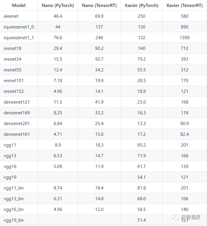./test.sh TEST_OUTPUT.md下面是一些英伟达边缘设备上(Nano、Xavier)的性能数据,如下。