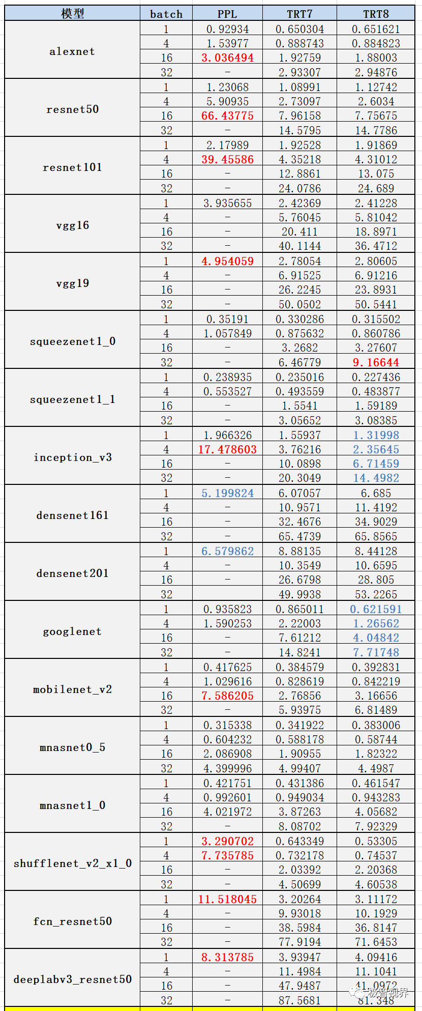 以下所有测评的网络均来自 pytorch model zoo,ppl.nn 和 tensorrt 的测试方法如1中介绍。